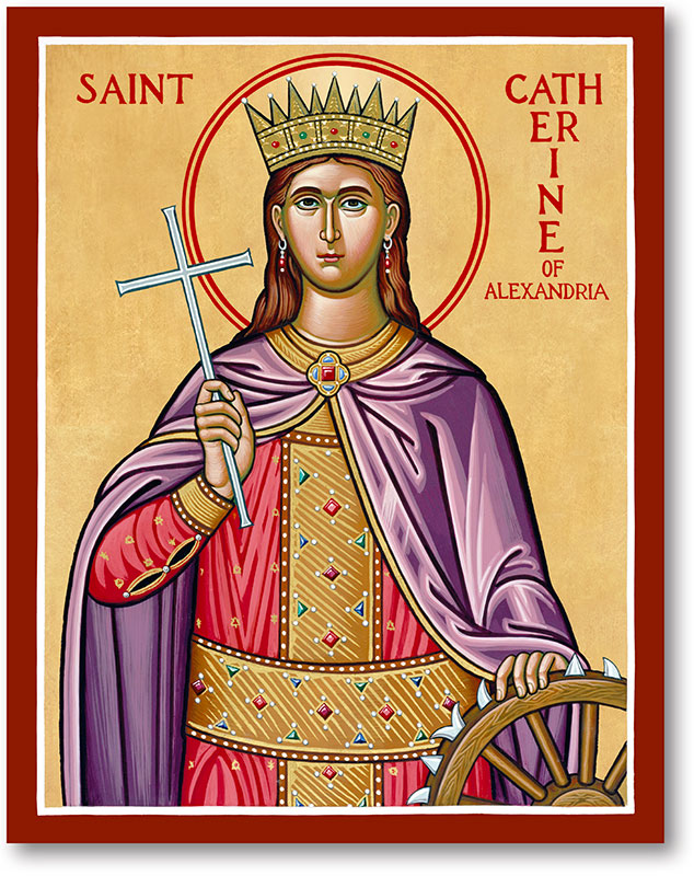 St. Catherine of Alexandria was born into a noble family in Alexandria, Egypt, and was known for her exceptional beauty and intellectual gifts. As a young woman, she converted to Christianity after a profound vision of Christ. She soon became known for her wisdom and eloquence, which led her to engage in a public debate with 50 of the most renowned philosophers and orators of the time. Catherine successfully converted many of them to Christianity.